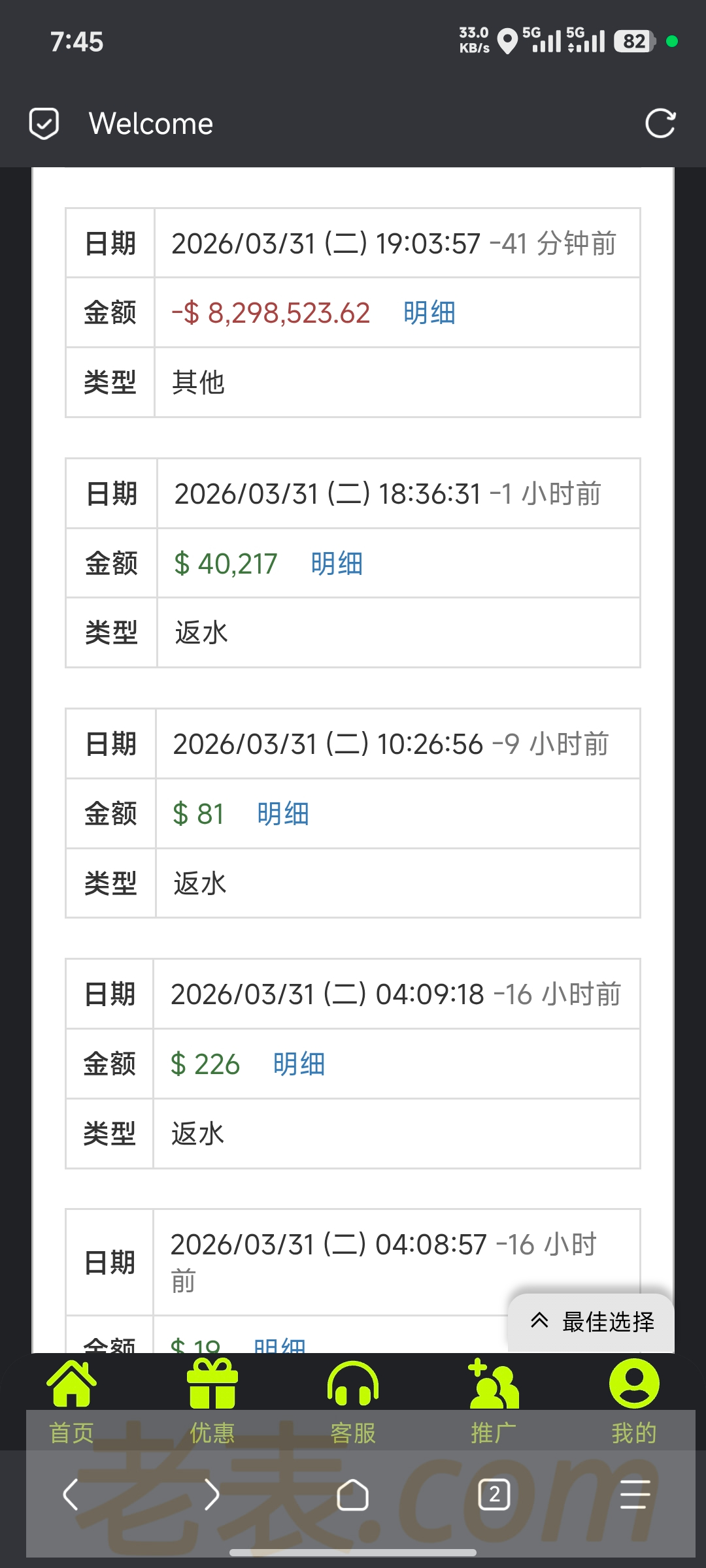 而且这个模板的台都不能玩真人,以前的pg.cc 说倍投是无风险投注警告我在玩扣除盈利,上个月我在0870玩evo真人也是警告我后续不能在玩evo 然后半个月前我被197必赢 直接扣除盈利退本